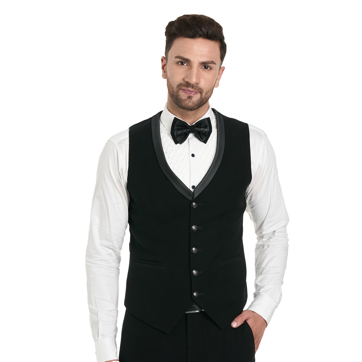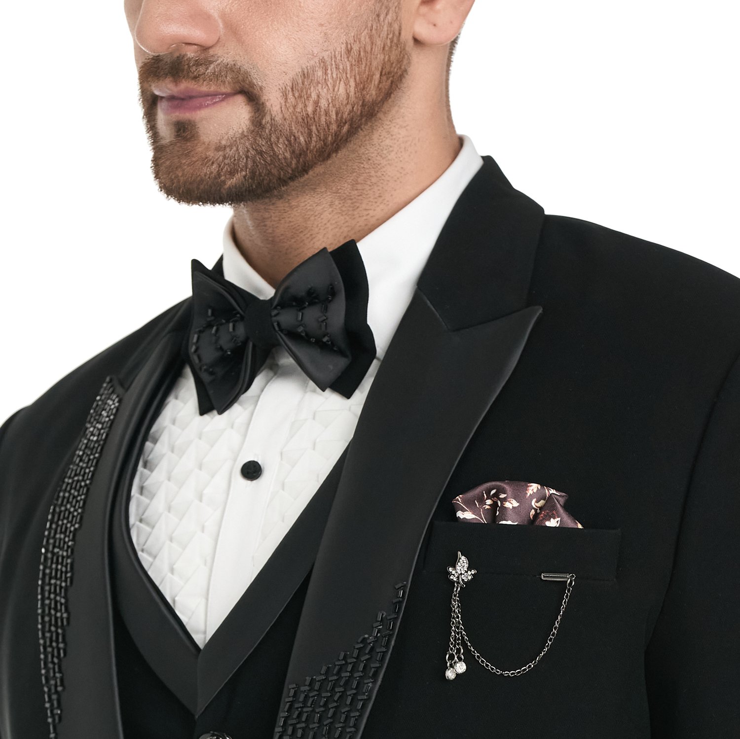 It includes 1 brooch, 1 pocket square, 1 tie, White tuxedo shirt & 1 Emb. bow, designer metal buttons.