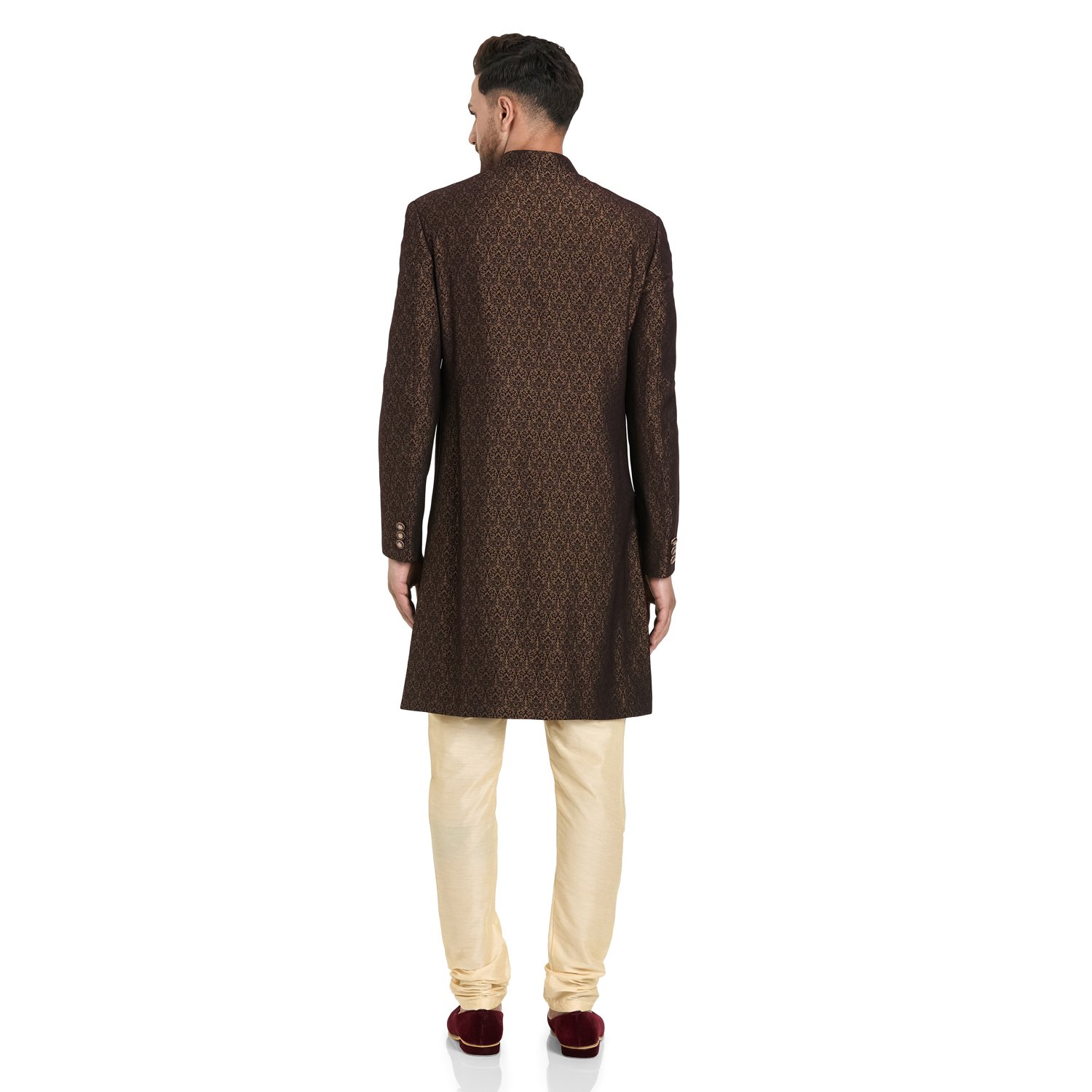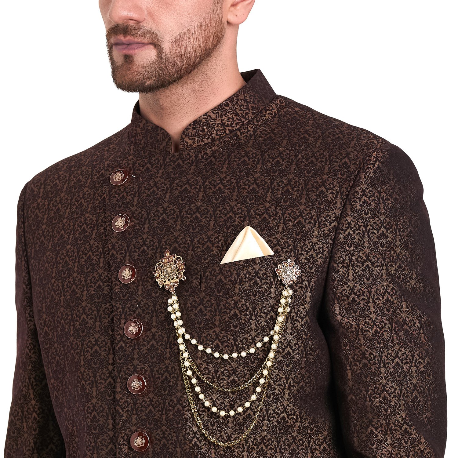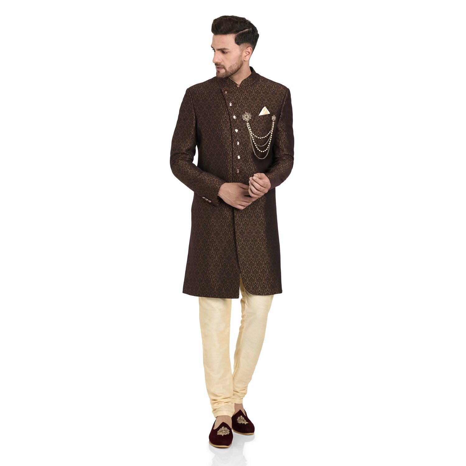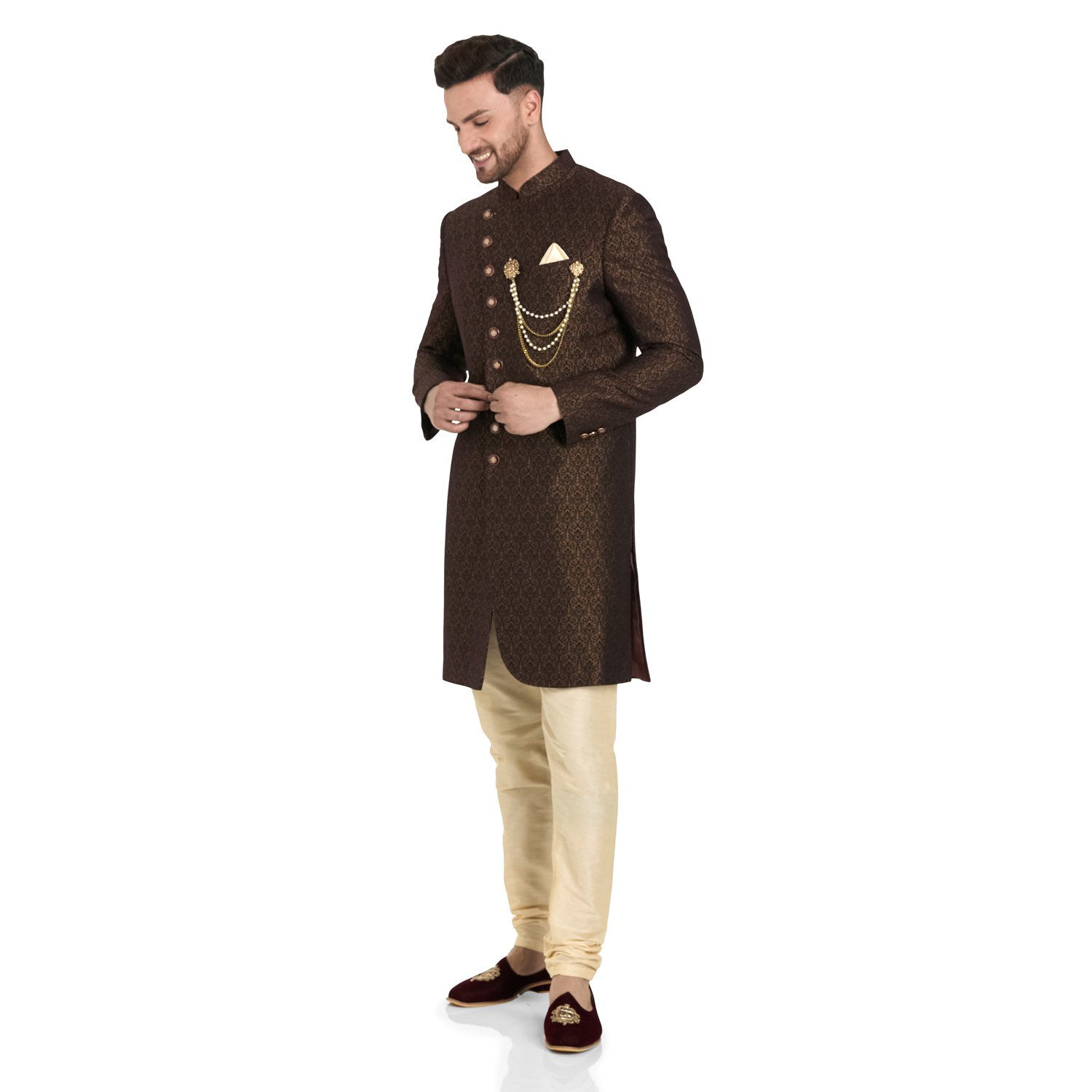 • It includes 1 brooch, 1 pocket square, designer metal buttons with Peshwri/with slim fit Cotton Trouser