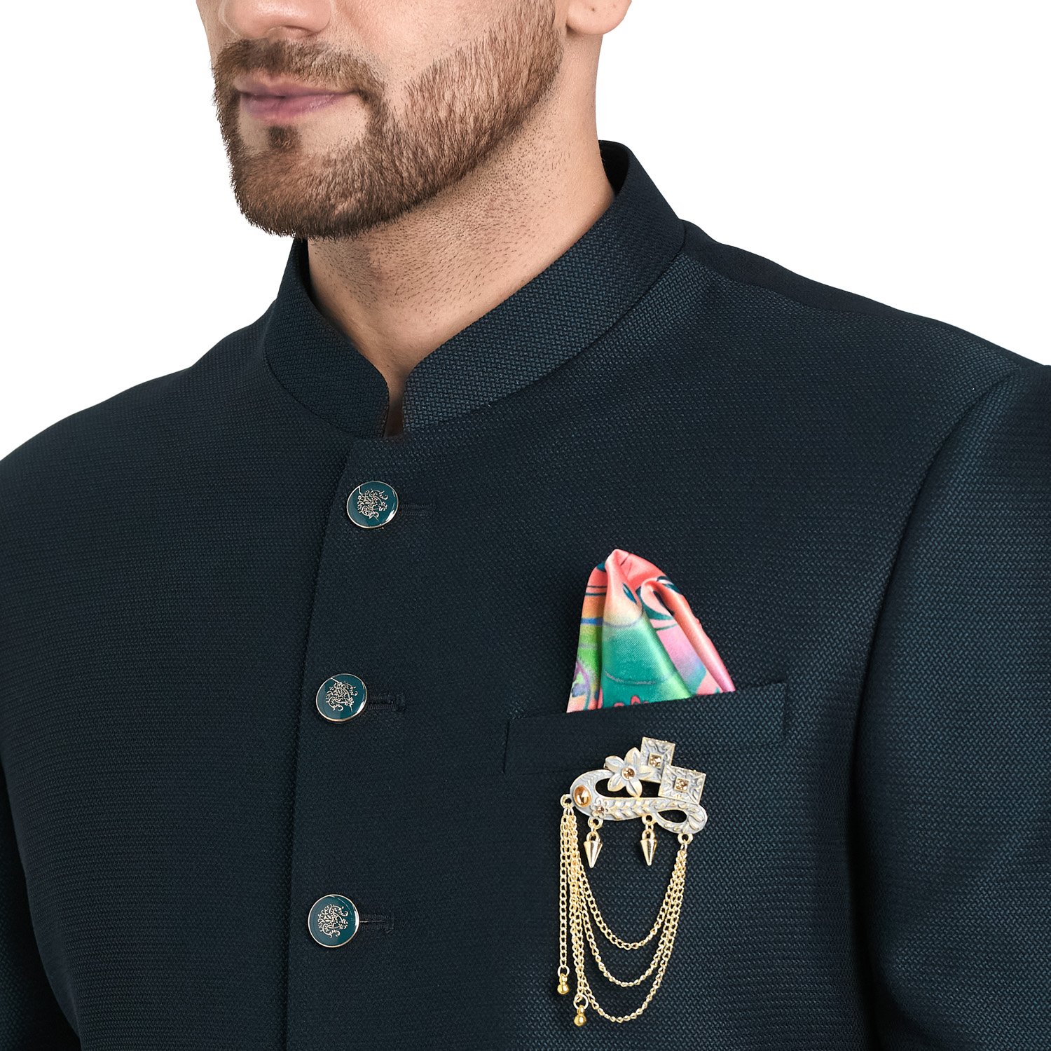 It includes 1 brooch, 1 pocket square, 1 tie, White tuxedo shirt & 1 Emb. bow, designer metal buttons.